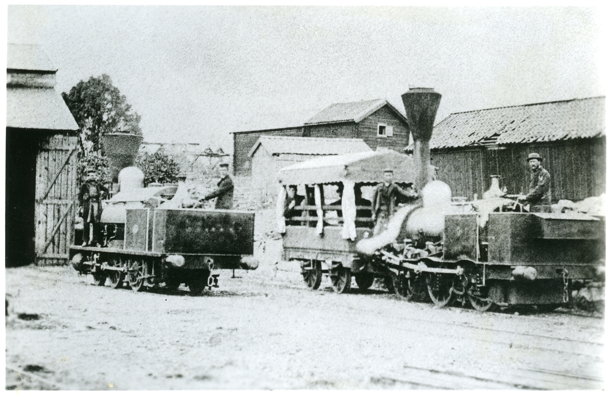 Tågsätt med ånglok, framför järnvägsstationen, c:a 1900.