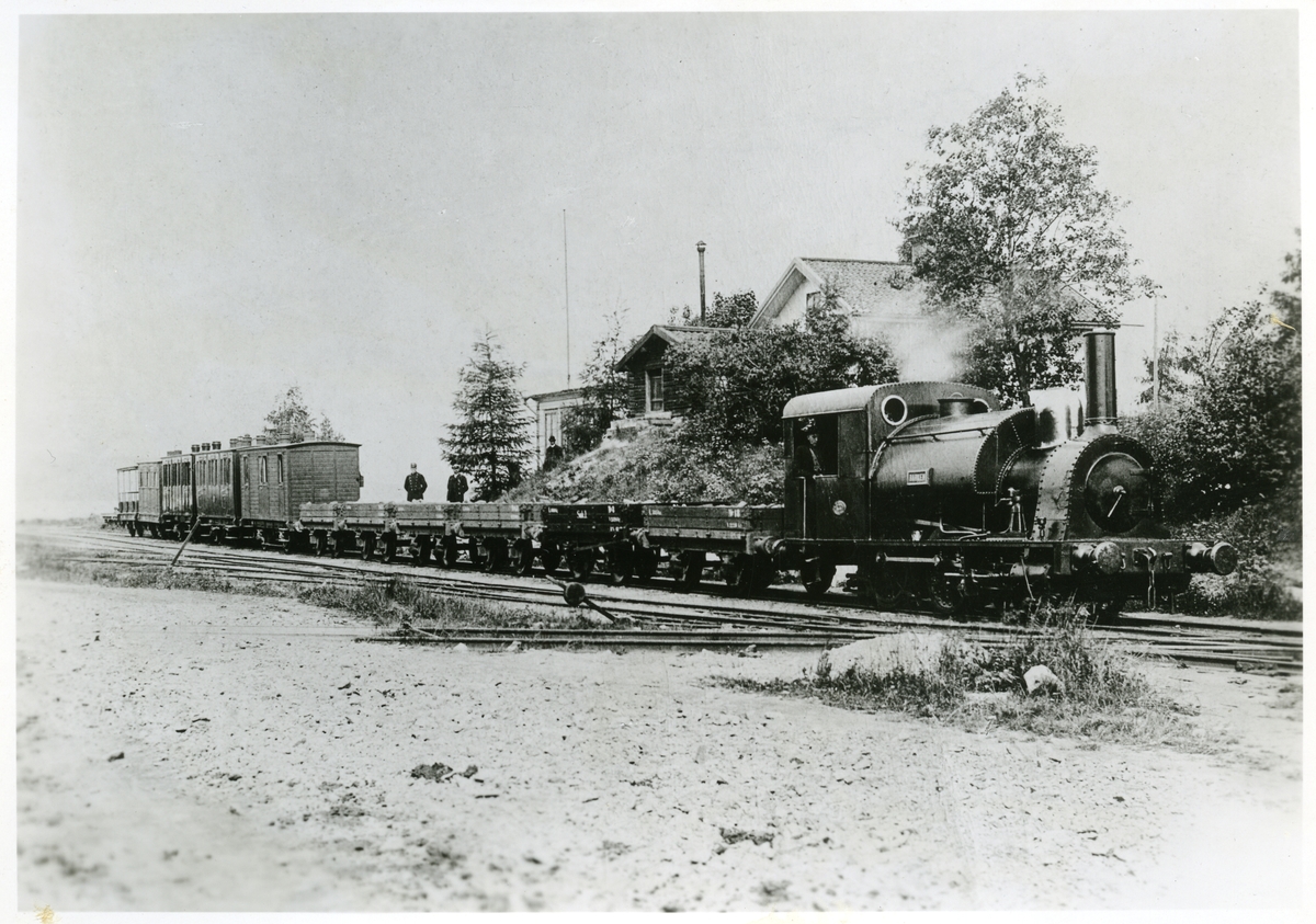 Tågsätt med ånglok, framför järnvägsstationen, c:a 1900.