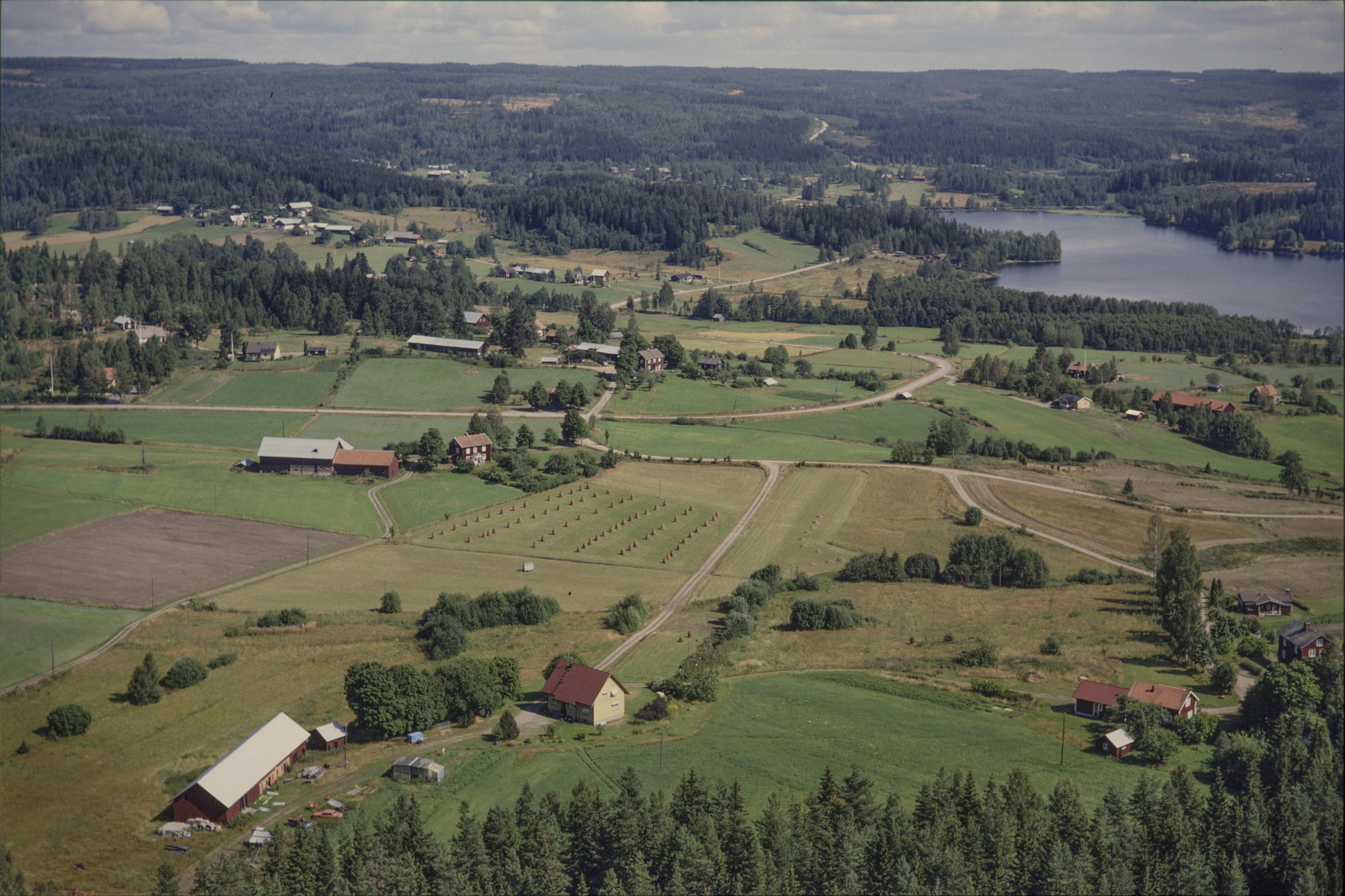 Takene by. I bildens mitt gård med hövålmar / höhässjor. Lyckan till höger. Över bildens mitt bytomt RAÄnr Brunskog 176:1. I bildens övre del sjön Rinnan. Bilden är tagen mot (väderstreck): NO