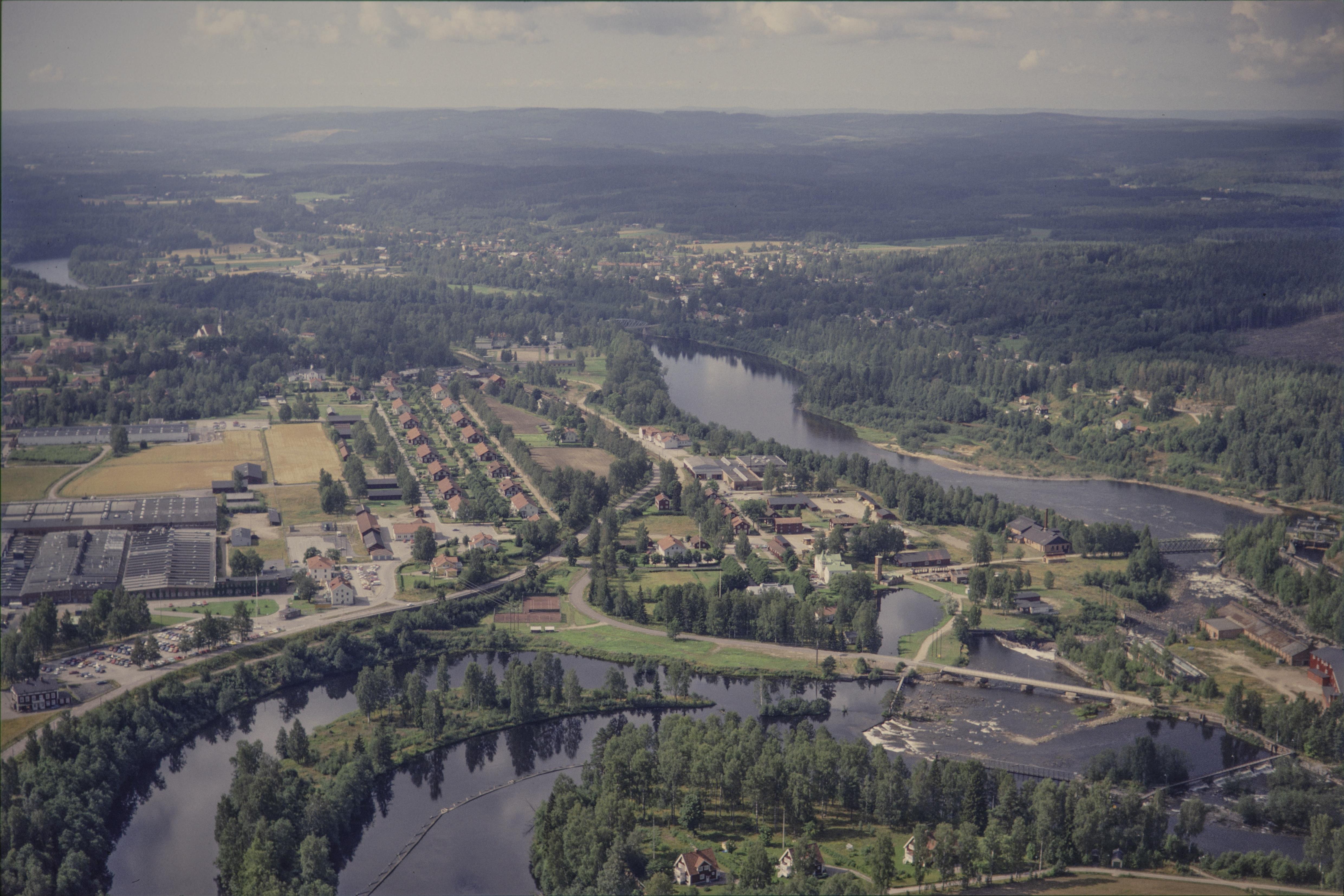 Munkfors bruk vid Klarälven. Vid bildens mitt Gamla bruket med bruksherrgård byggnadsminne RAÄnr Ransäter 36:1. Bilden är tagen mot (väderstreck): VSV