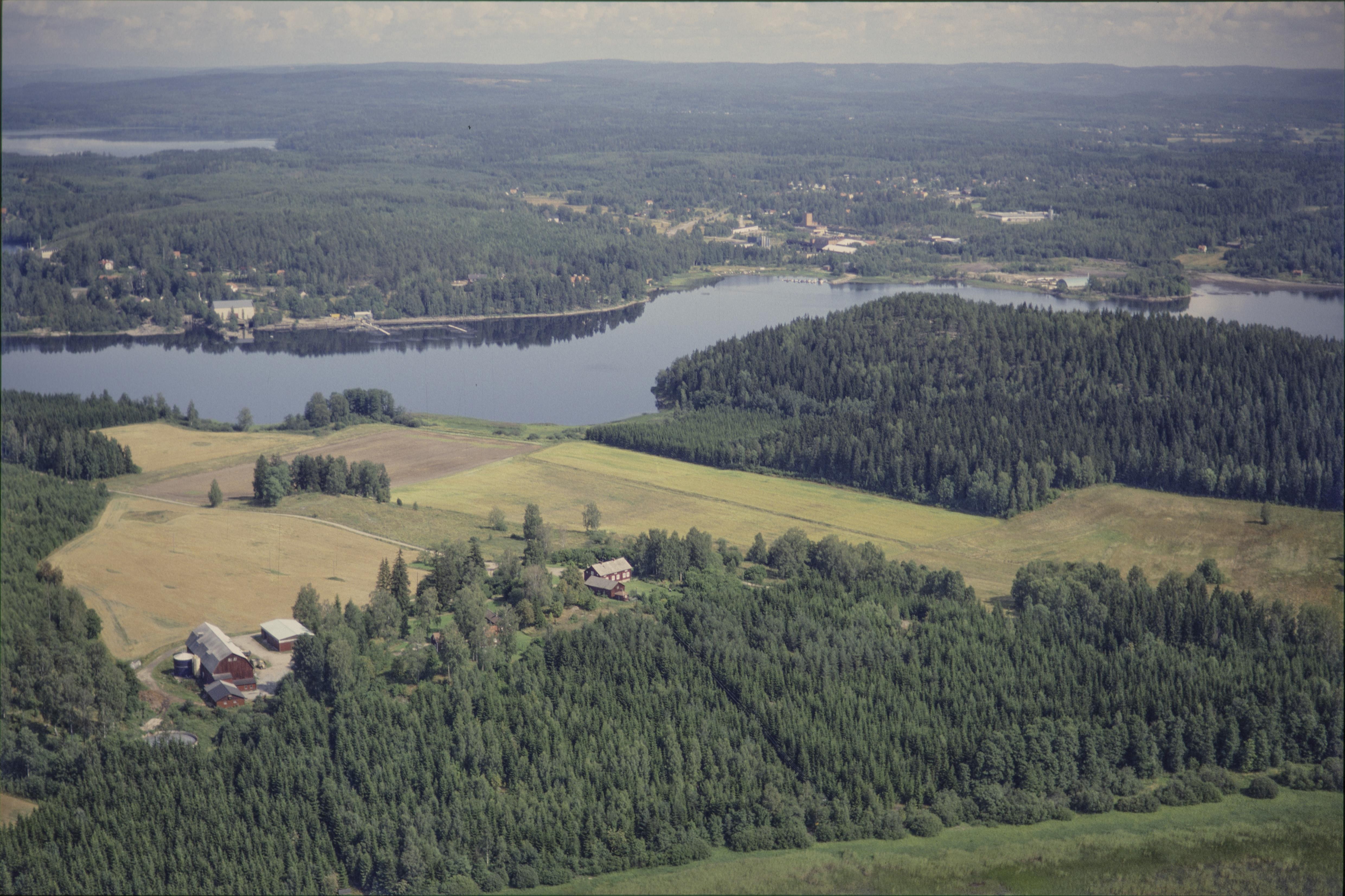 Bergs gård / Bergs majorboställe. Bergs gamla tomt RAÄnr Älgå 51:1 till vänster om bildens mitt. Rösen Älgå 16:1-3 vid Älgåfjorden uppe till höger. Bilden är tagen mot (väderstreck): NO