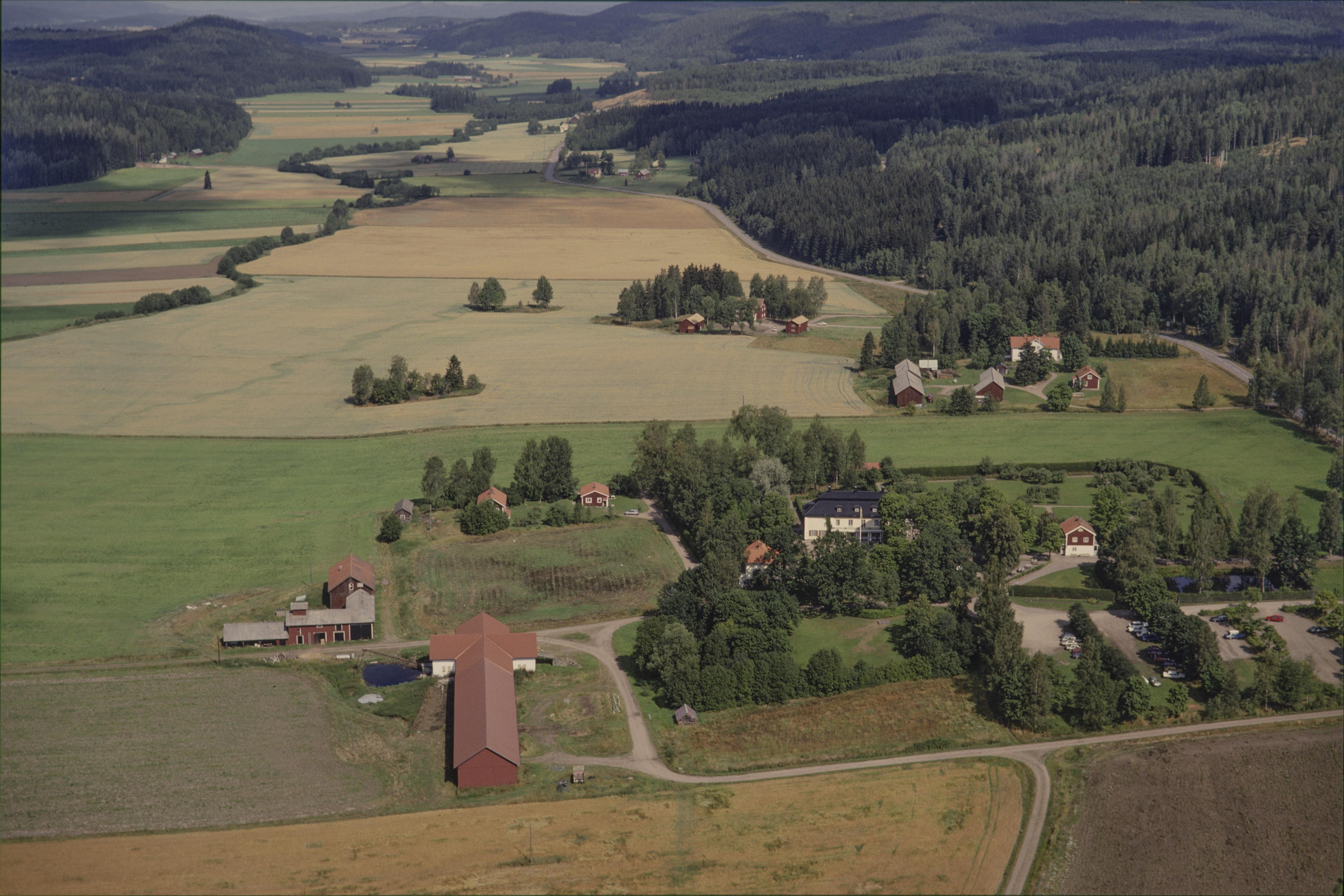 Ån Ämtans dalgång. Till höger om bildens mitt minnesgård för författaren Selma Lagerlöf / Mårbacka gård RAÄnr Östra Ämtervik 288:1. I bildens övre del Sunne socken. Bilden är tagen mot (väderstreck): N