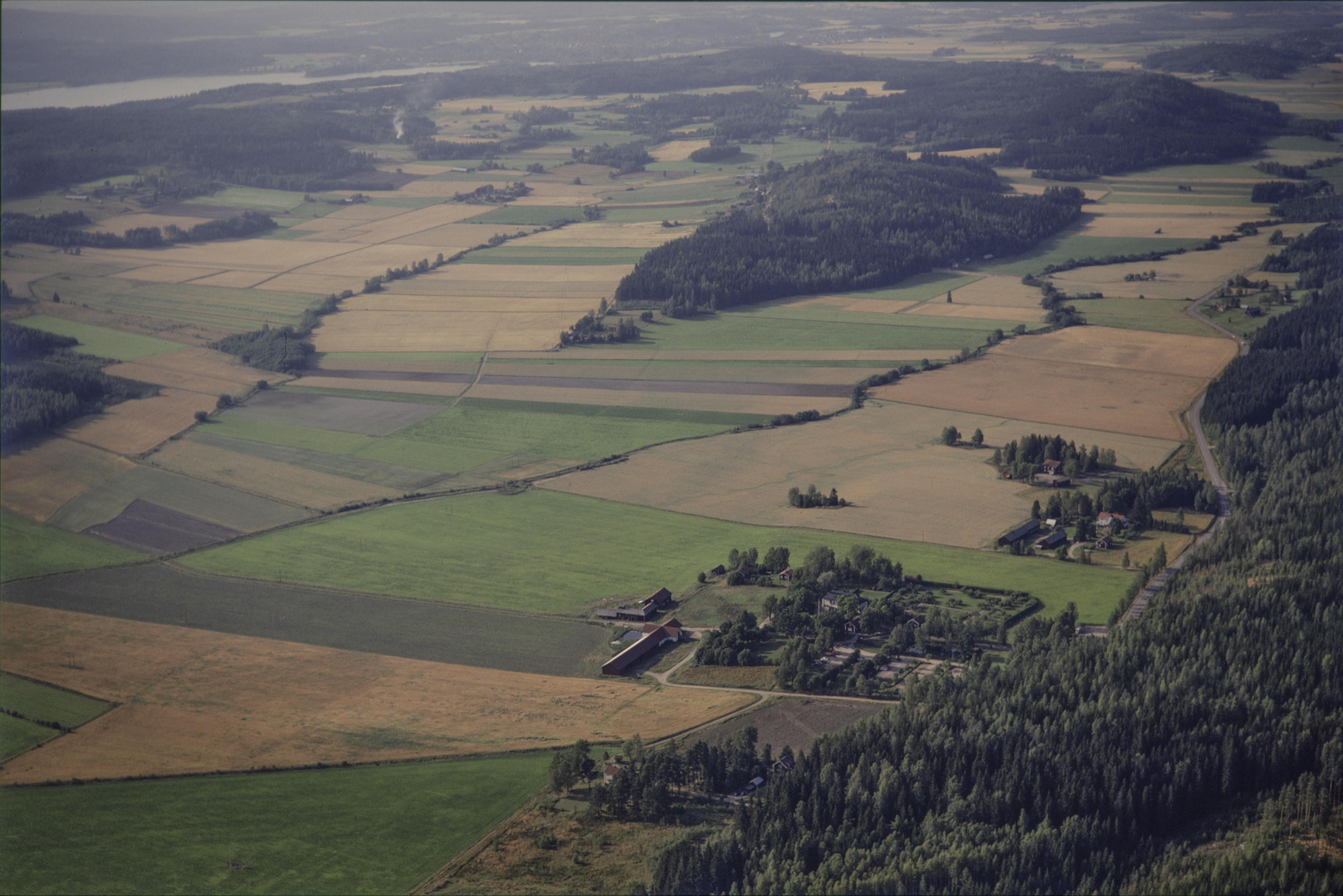Ån Ämtans dalgång. Till höger om bildens mitt minnesgård för författaren Selma Lagerlöf / Mårbacka gård RAÄnr Östra Ämtervik 288:1. I bildens övre del Sunne socken. Bilden är tagen mot (väderstreck): NV