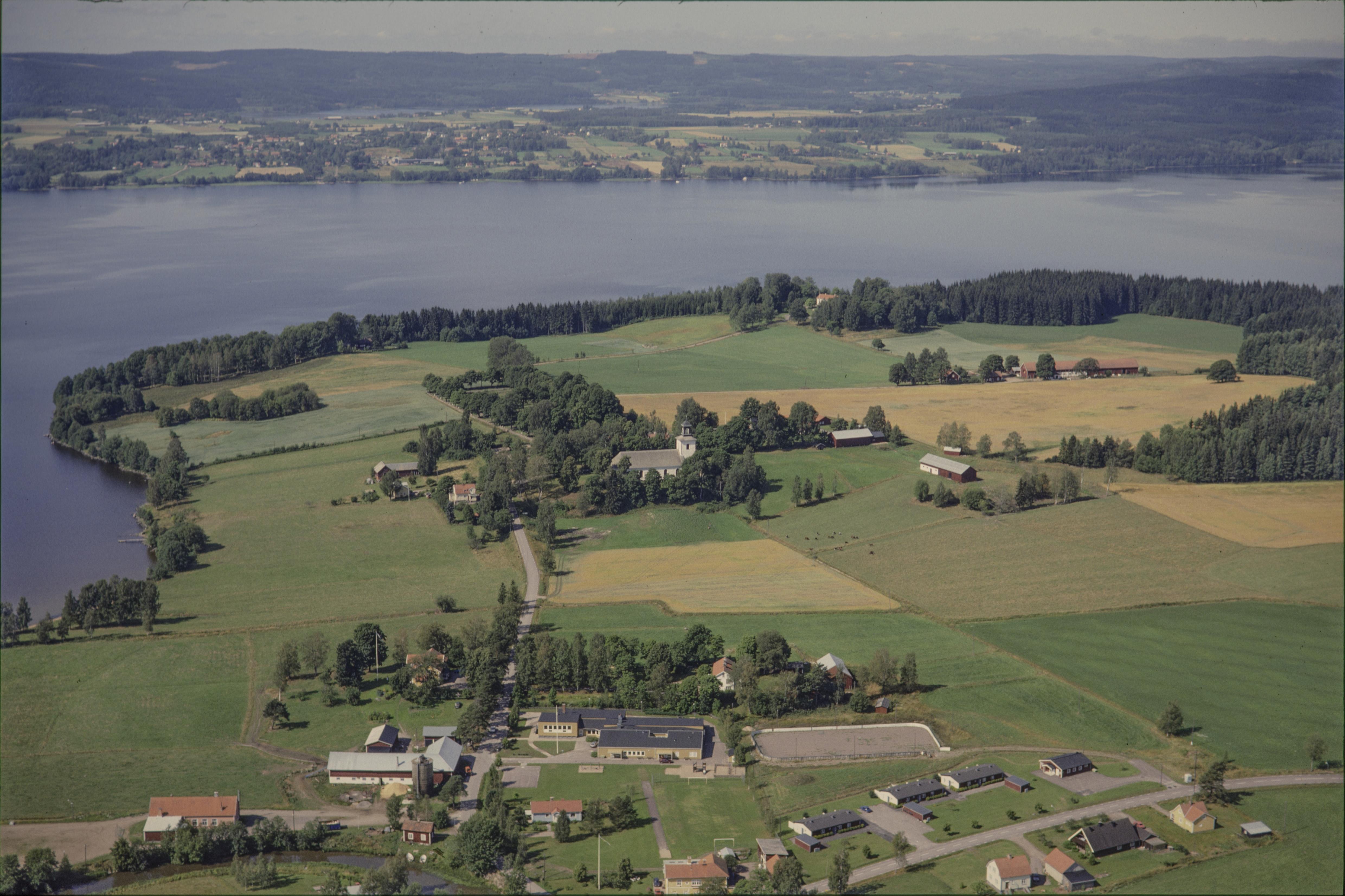 Östra Ämterviks kyrka vid bildens mitt. I bildens övre del sjön Mellan-Fryken. Bilden är tagen mot (väderstreck): V