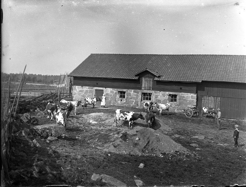 Med korna utanför ladugården.