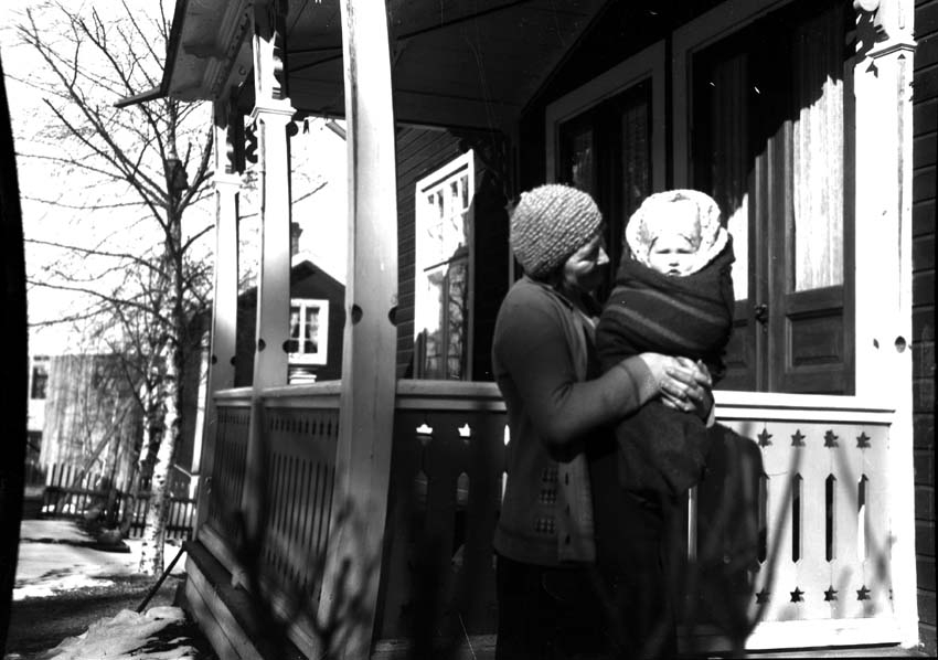 Kvinna med litet barn i famnen på förstutrappen.
