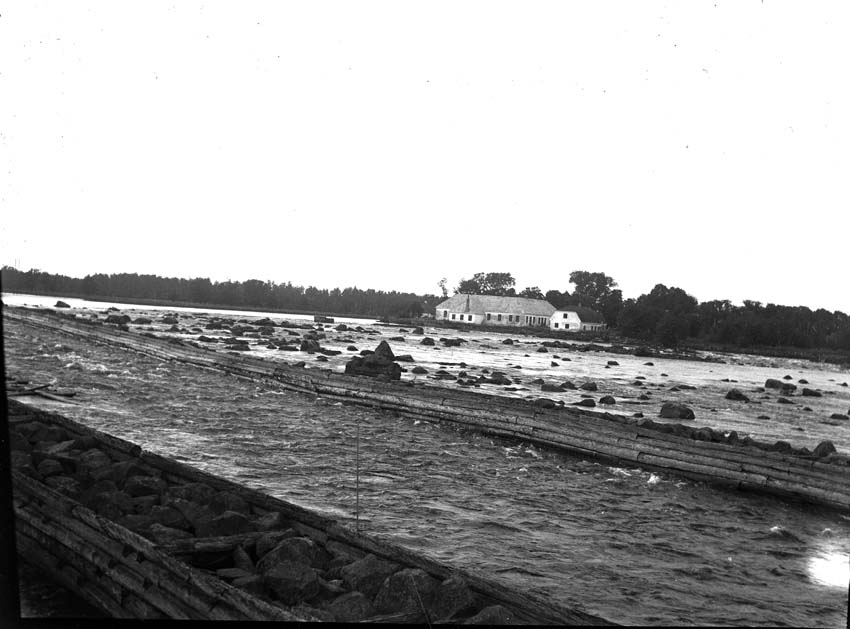 Vattenkanal/ränna med en gård i bakgrunden.