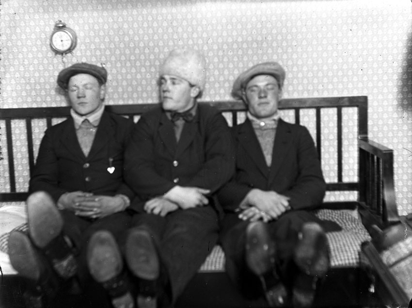 Tre män sitter avslappnat i kökssoffan med fötterna på bordet.
