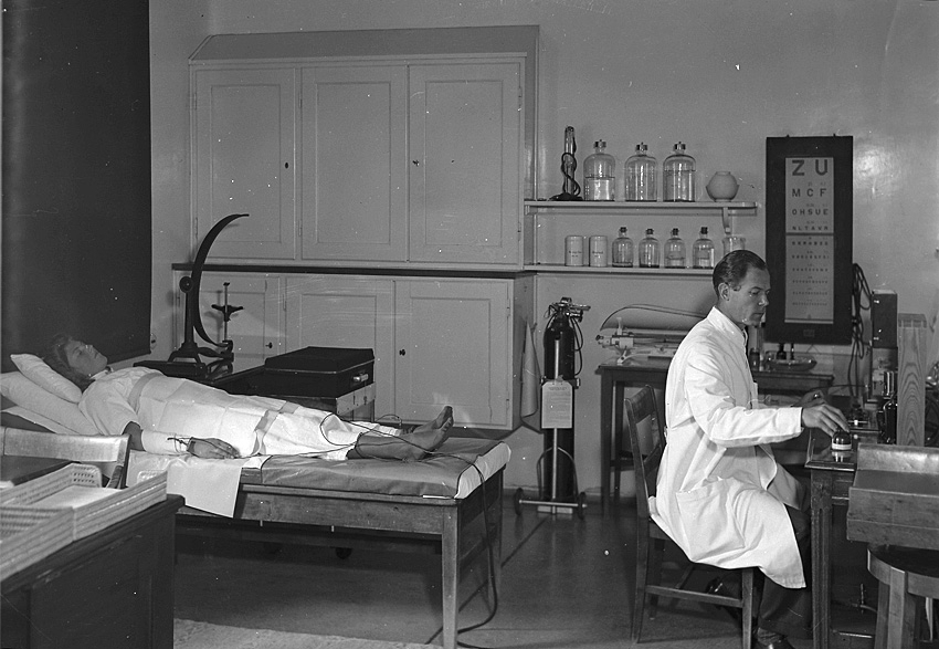 Okänd läkare behandlar patient i behandlingsrum.