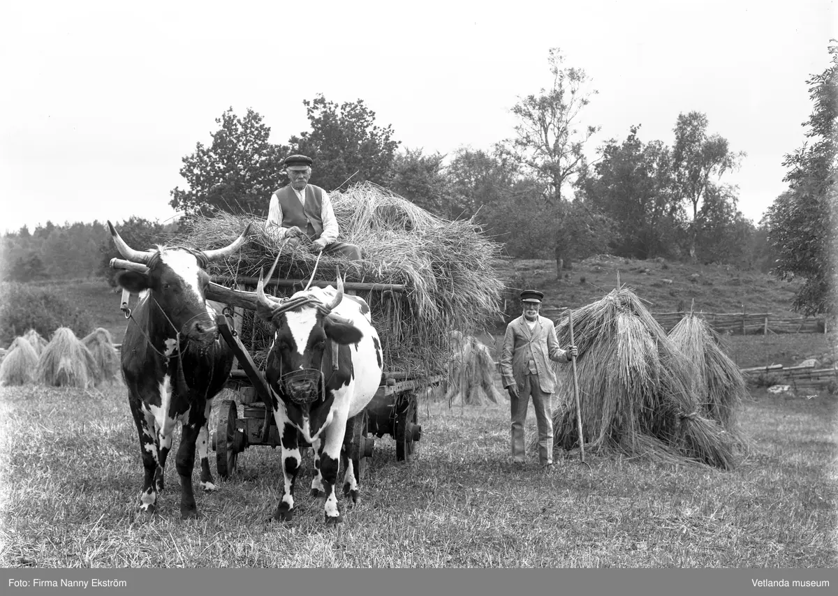Oxar som drar hölass i Bockaberg, i Ramkvilla eller Bäckseda i Vetlanda kommun.