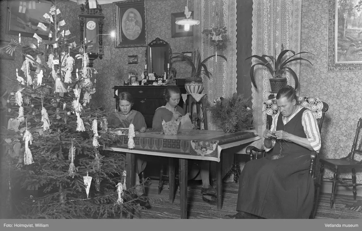 Kvinna och flickor som handarbetar vid julgran. Fotografi från området Österstand i Vetlanda.