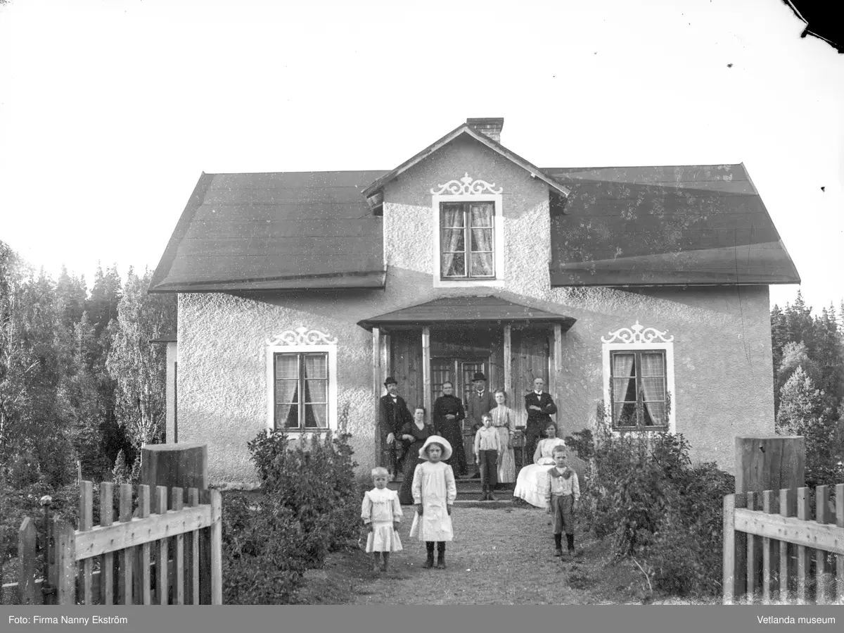 Familj framför villa i Kvillsfors. Troligtvis Gunnar Svenssons hus.