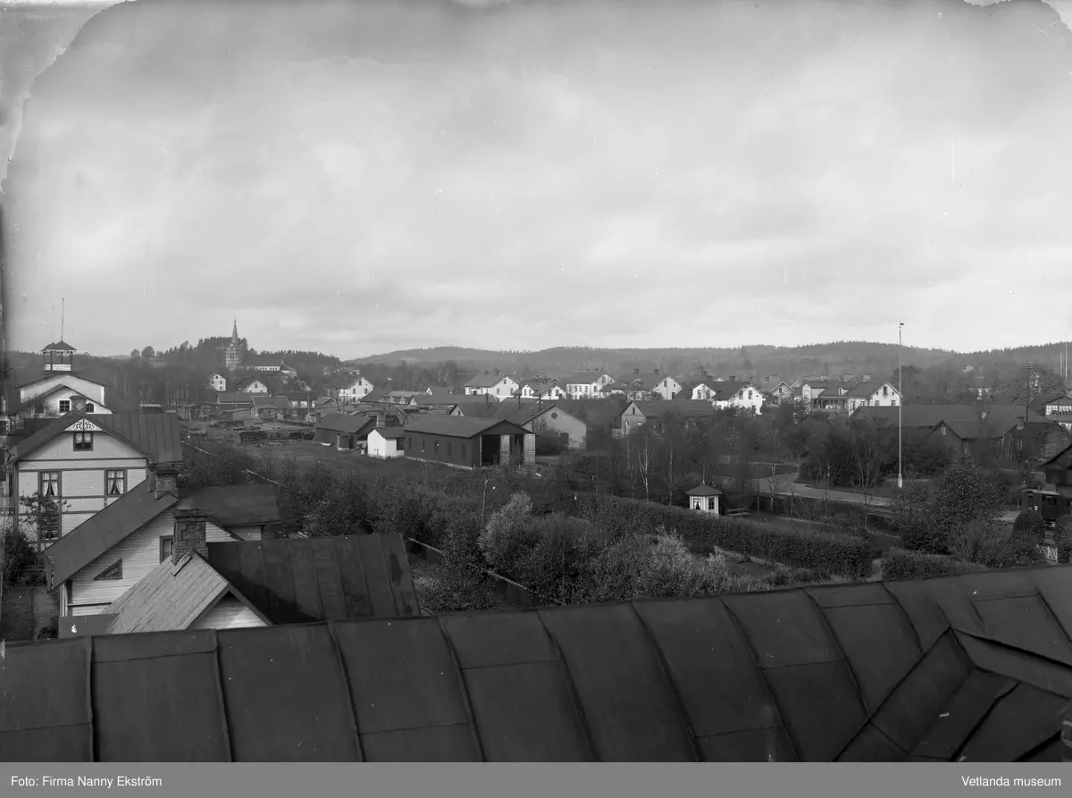 Utsikt över Vetlanda från disponent Nilssons villa ("Sollinska huset"), oktober 1903 (renovering av kyrkan pågår).