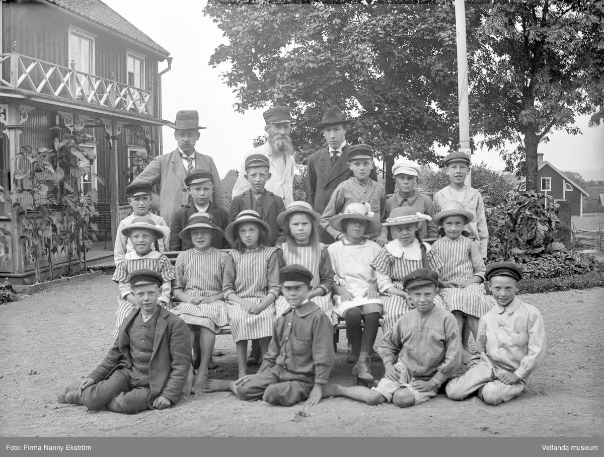 Skolbarn i Ö. Ökna, troligtvis hösten 1916. Mannen längst bak i mitten är Kantorn Svensson.