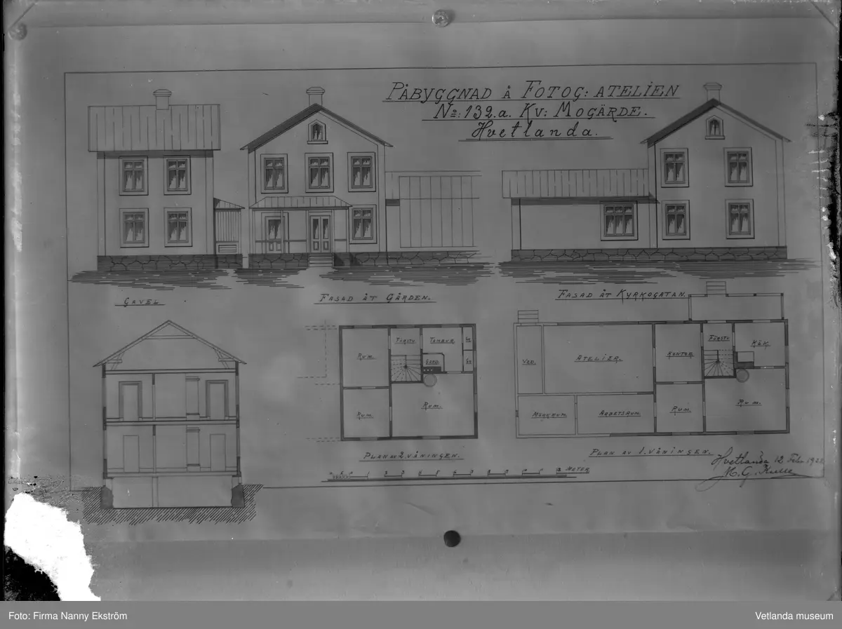 Ritning av påbyggnaden på Nanny Ekströms fotoateljé, kvarteret Mogärde i Vetlanda, februari 1922.