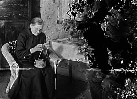 EN ÄLDRE KVINNA SITTER OCH STICKAR
