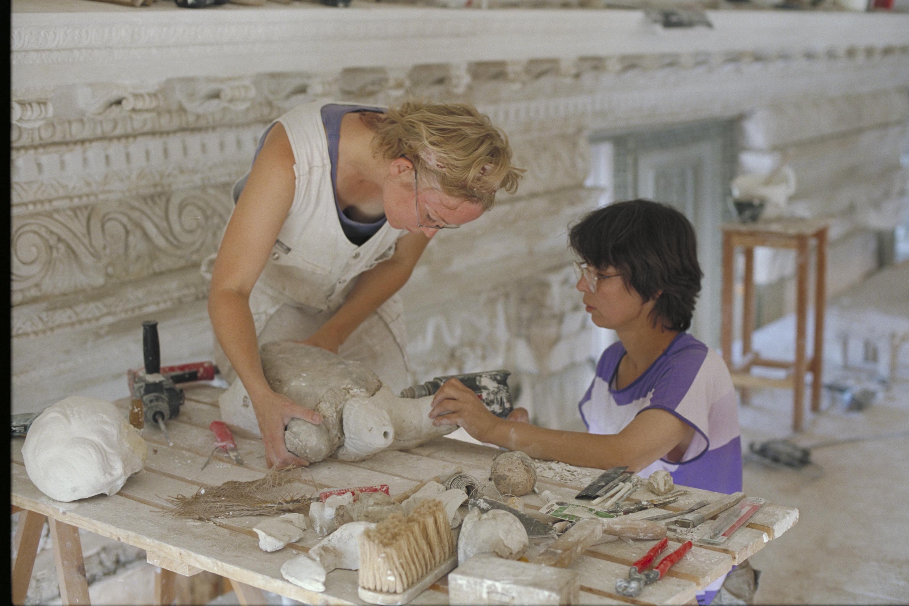 Beskrivning: Riddarsalen. Montering av stuckaturdetaljer.