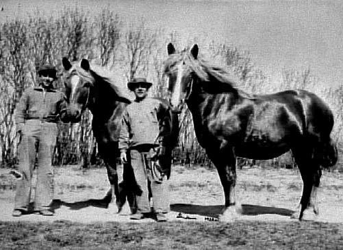 TVÅ MÄN STÅENDE MED VARSIN HÄST.