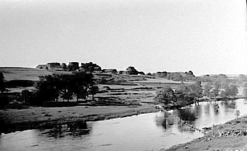 VY ÖVER HORNBORGA Å OCH BY, MED DEN TOMMA BOPLATSEN FÖR HORNBORGASTUGAN, SOM NU STÅR PÅ SKANSEN I STOCKHOLM.