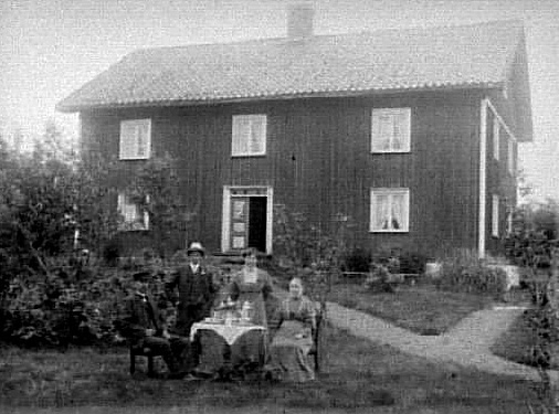 SLÄKTGRUPP VID ETT KAFFEBORD I TRÄDGÅRDEN FRAMFÖR ETT TVÅVÅNINGS BOSTADSHUS I TRÄ.
