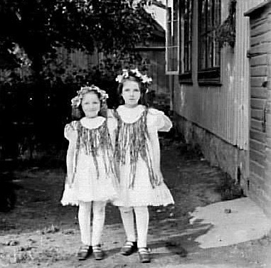 TVÅ SMÅ FLICKOR MED BLOMSTERKRANSAR I HÅRET.