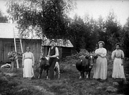 TRE KVINNOR OCH EN MAN MED KOR PÅ LADUGÅRDSBACKEN