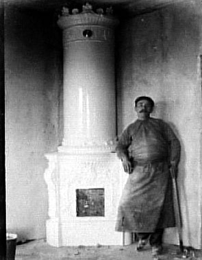 PLÅTSLAGARE J. MAGNUSSON VID EN KAKELUGN.
