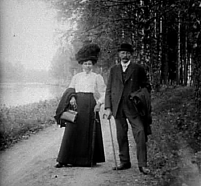EN MAN OCH EN KVINNA PÅ PROMENAD PÅ KANALBANKEN.