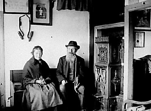 INTERIÖR AV BOSTADSHUS. PÅ VÄGGEN TVÅ RÖKPIPOR OCH I RUMMET EN GJUTJÄRNSKAMIN.