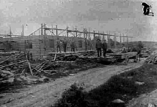 Arbetslag framför halvfärdig byggnad.