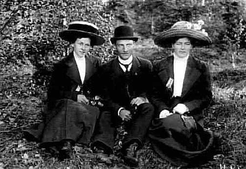 EN MAN OCH TVÅ KVINNOR SITTANDE I GRÄSET