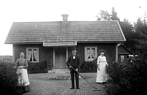 EN MAN SKRATTAR GÅRDSPLANEN, TVÅ KVINNOR TITTAR PÅ.