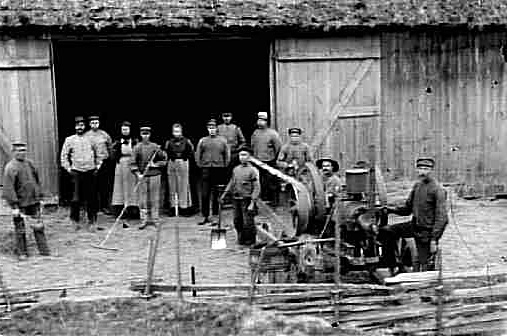 TRÖSKLAG SAMLAT OMKRING RÅOLJEMOTORN SOM DRIVER TRÖSKVERKET.
