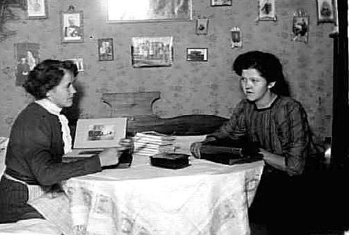 TVÅ KVINNOR SITTER VID ETT BORD OCH TITTAR PÅ FOTOGRAFIER.
