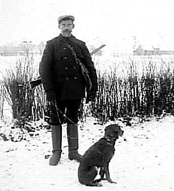 EN MAN SOM ÄR UTE OCH JAGAR, HAR HUND I KOPPEL.