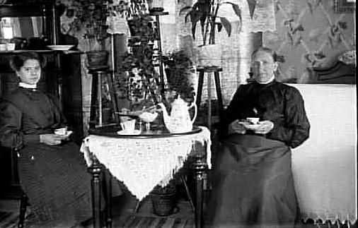 TVÅ KVINNOR DRICKER KAFFE I FINRUMMET.