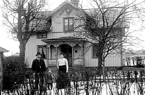 FAMILJ STÅENDE I TRÄDGÅRDEN FRAMFÖR HUSET.