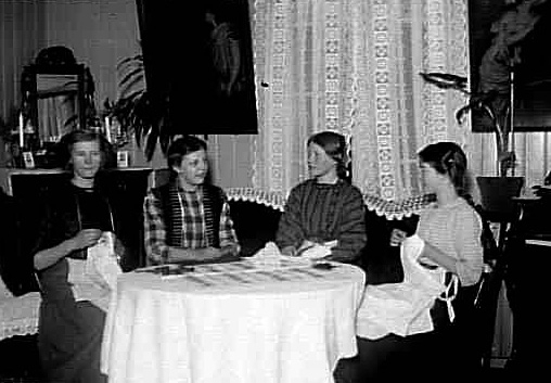 FYRA KVINNOR SITTER RUNT ETT BORD OCH HANDARBETAR.