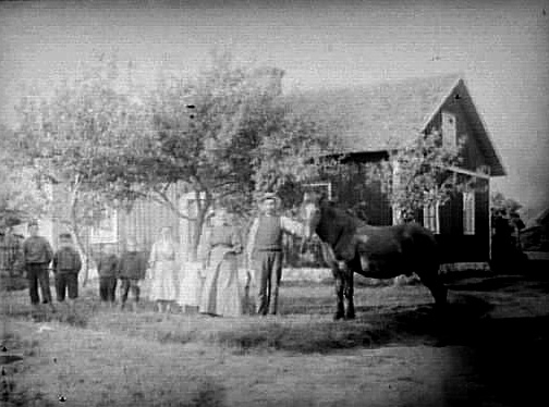 EN FAMILJ I TRÄDGÅRDEN FRAMFÖR ETT BOSTADSHUS MANNEN HÅLLER EN HÄST