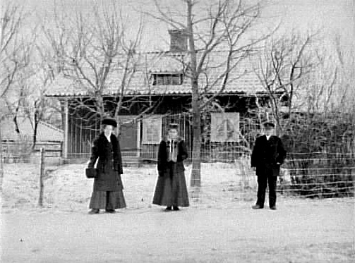 TVÅ KVINNOR OCH EN MAN FRAMFÖR ETT HUS