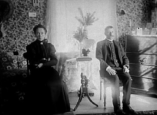 ETT PAR SITTER VID ETT BORD I FINRUMMET.