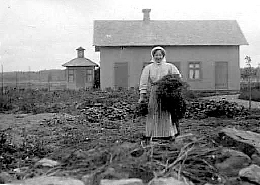 EN KVINNA STÅENDE FRAMFÖR ETT UTHUS OCH DASS.