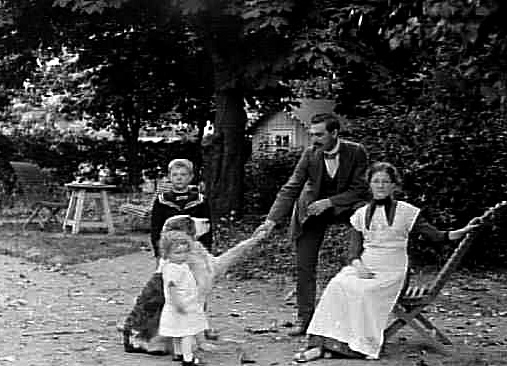 EN FAMILJ SOM LEKER MED HUNDEN I TRÄDGÅRDEN.
