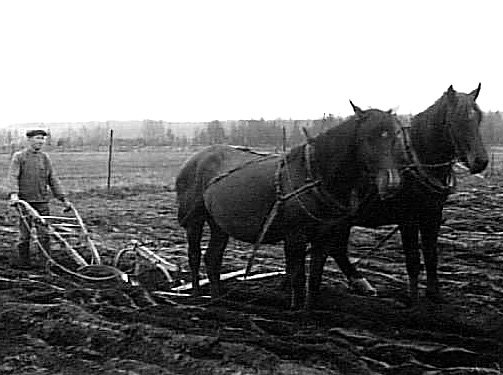EN MAN PLÖJER MED ETT PAR HÄSTAR.
