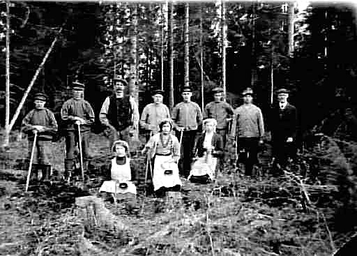 Ett arbetslag har rast vid skogsplantering i april 1913.