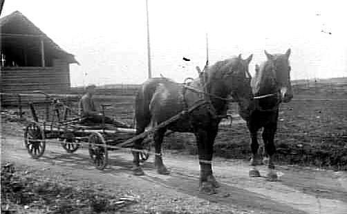 EN MAN SOM KÖR TVÅ HÄSTAR FRAMFÖR EN ARBETSVAGN LASTAD MED EN PLOG