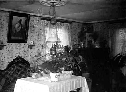 Bostadsinteriör med krukväxter och en fotogentaklampa vars fäste omges av en takrosett.