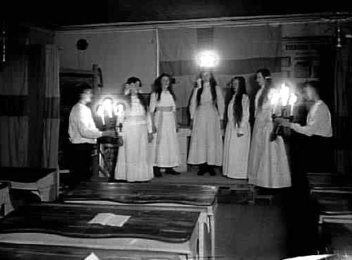 Lucia med tärnor samt två gossar som håller var sin ljusstake.