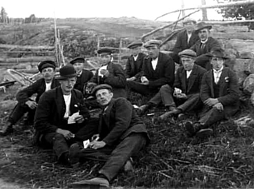 ELVA MÄN SITTER OCH SPELAR KORT I GRÄSET INTILL EN STENMUR.