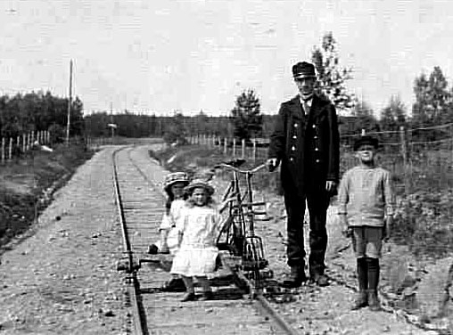 EN MAN MED TRE BARN VID OCH PÅ EN DRESSIN.